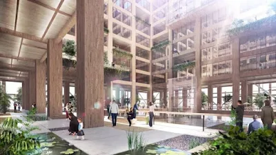 Más ligera y más eficiente de usar que otros materiales estructurales, la madera diseñada tiene una huella ambiental mucho menor que la del concreto , que produce hasta el 8% de las emisiones mundiales. Los edificios resultantes, que a menudo emplean interiores de madera a la vista, están destinados a provocar una sensación de calidez y alegría en los visitantes, dijo Jonathan King, un arquitecto con sede en Toronto. "Como especie, trepamos por lugares donde hay materiales naturales a nuestro alrededor", dijo.